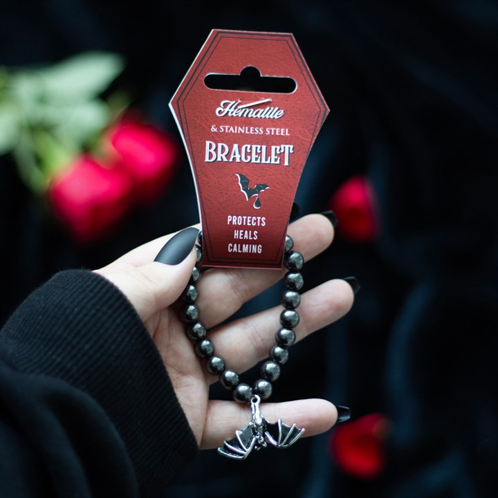 This gothic bat bracelet makes a unique piece to add to any jewellery collection. The hematite beads offer grounding energy,...